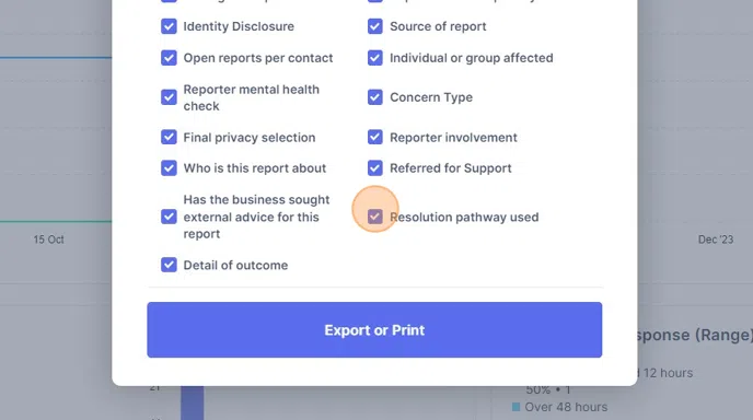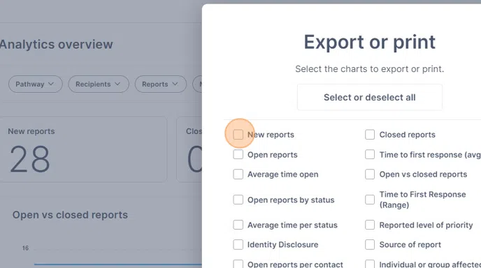 Tip: Tip! You can select mutliple different report attribute headers and choices. E.g. Filter by reports affecting individuals, with a legal concern type.